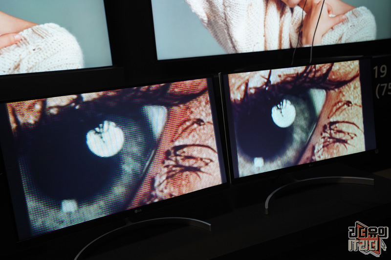 눈동자를 확대해서 보여줬는데 8K QLED TV는 도트가 뭉개지는 현상이 보였습니다. 8K LG 나노셀 TV는 픽셀이 부드럽게 이어지는 반면, 8K QLED TV는 격자 무늬가 꽤 선명하게 보이기도 했습니다. 같은 8K TV인데 너무나 큰 차이에 놀랐습니다.