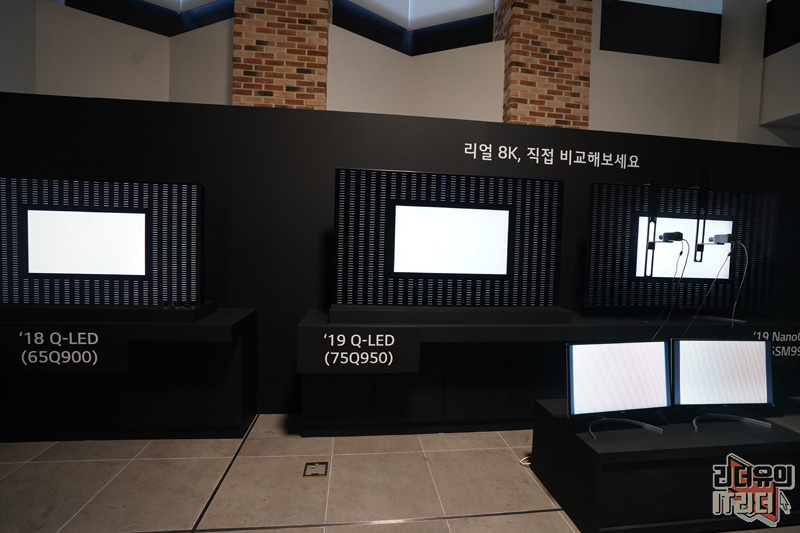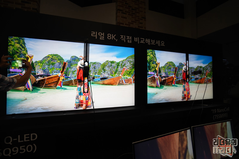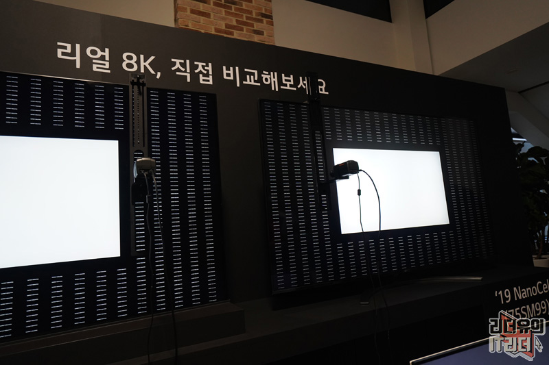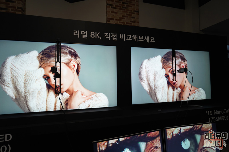 하나는 8K QLED TV, 하나는 8K LG 나노셀 TV에 배치하여 똑같은 대상을 확대해서 보여줬습니다.