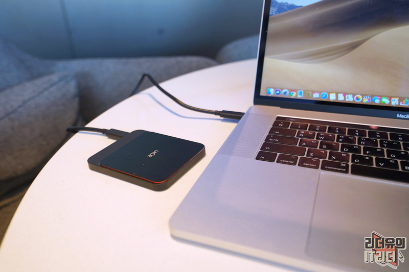 맥북프로에 연결한 모습입니다. 작동 상태를 알리는 LED 램프가 있어 데이터 처리 상태를 알 수 있고 별도의 전원선이 필요하지 않기 때문에 간편하게 연결해서 사용이 가능합니다. 참고로 제가 사용하는 모델은 라씨 포터블 SSD 500GB이지만 더 큰 용량도 선택이 가능하니 자신의 업무 상황에 맞춰 선택을 하시면 됩니다.