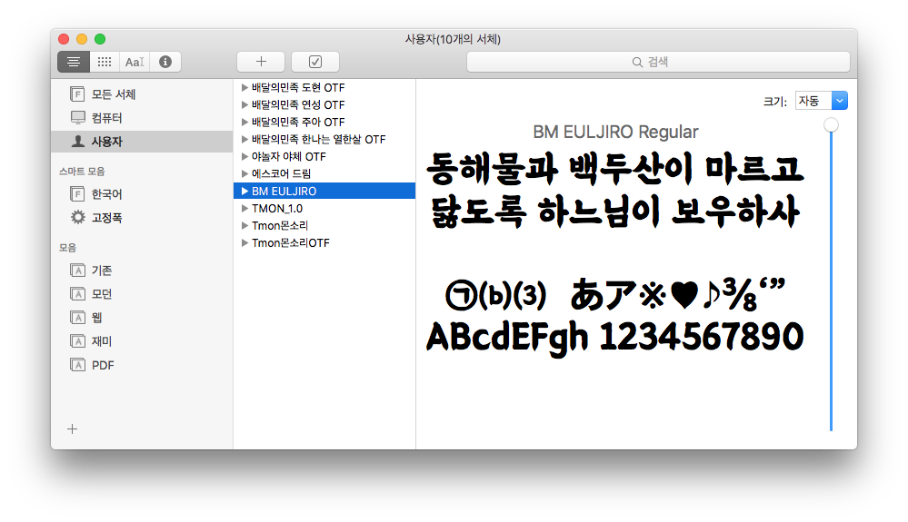 서체가 설치되면 사용자 모음에 들어가게 됩니다. 어떤 폰트인지 한눈에 확인이 가능하니 참고해 두시기 바랍니다.