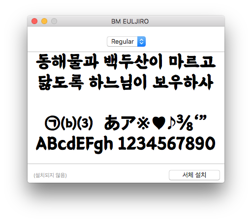 배달의민족 을지로체는 윈도우용, 맥용 다 지원합니다. 한글, 특수문자, 영어, 숫자까지 다 을지로체로 바뀌는걸 확인할 수 있습니다. 맥에서 서체 설치는 간단합니다. 해당 파일을 누르면 위와같이 서체 설치가 나오고