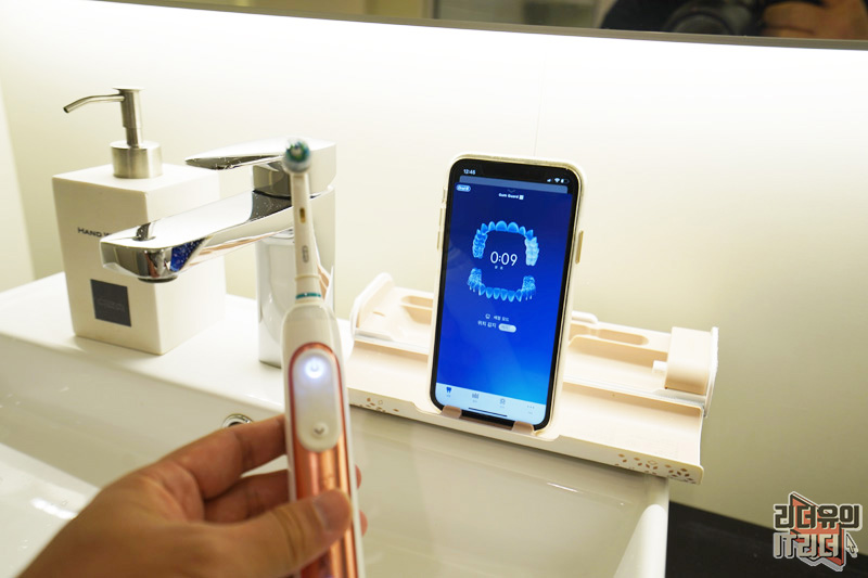 오랄비 지니어스 9000은 모션 센서를 탑재해 스마트폰 화면을 보면서 양치를 할 수 있습니다. 물론 이 기능은 계속 쓸 기능은 아니고 양치를 잘 못하는 분들이 이용하면 좋습니다. 2분간 치아의 위치별로 고르게 칫솔질을 할 수 있도록 가이드 해주기 때문에 보면서 따라하면 옳바른 양치습관을 키우는데 도움이 됩니다. 그리고 양치가 끝나면 칫솔질에 대한 평가도 해주기 때문에 치아관리를 체계적으로 할 수 있어 좋습니다. 매일 최소한 2회는 양치하는 습관을 만들어 주기 때문에 건강한 치아를 유지할 수 있습니다.