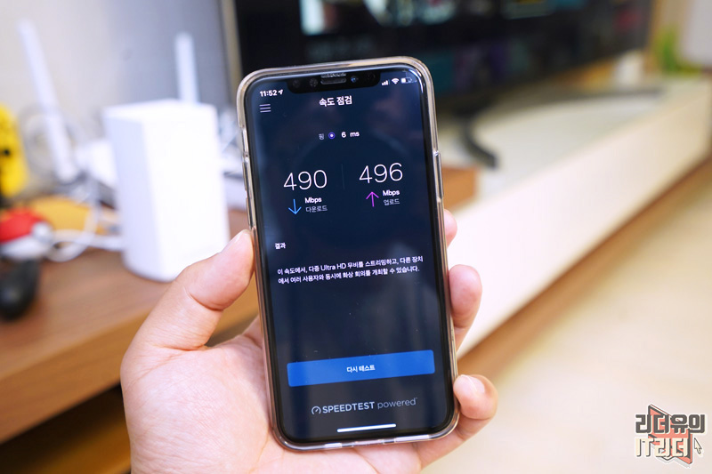 다운로드 490Mbps, 업로드 496Mbps가 나왔습니다. 속도 정말 빠르죠. 무엇보다 안정적인 속도로 집안의 인터넷망을 구축하게 됩니다.