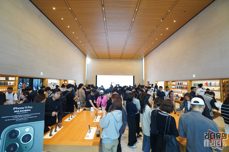 아이폰11, 애플워치5 출시 첫날 애플스토어 가로수길 내부의 모습입니다. 언제나 사람이 북적이는 공간이지만 특히 이날은 새로운 아이폰11, 아이폰11 프로, 애플워치5를 보기 위해 많은 사람들이 애플스토어 가로수길을 찾았습니다.