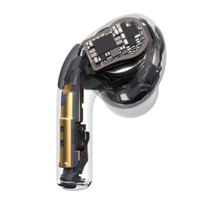 에어팟 프로는 애플이 설계한 H1 칩을 코어에 담은 혁신적인 SiP(System-in-Package)로 설계가 되어 있습니다. 그렇기에 노이즈캔슬링 이어폰이지만 작게 만들 수 있었고 성능까지 최고로 끌어올릴 수 있게 된 것입니다. H1칩은 10개의 오디오 코어를 장착했고 사운드부터 Siri까지 모든것을 관장하게 되는 칩입니다. H1의 극저 오디오 처리 지연으로 실시간 노이즈 캔슬링 기능을 구현했고 적용형 기술을 사용해 고품질 사운드 재생, 그리고 음성으로 컨트롤 할 수 있는 시리기능까지 완벽한 에어팟 프로의 성능을 제시하고 있습니다.