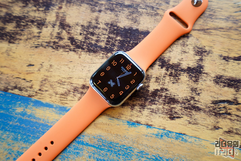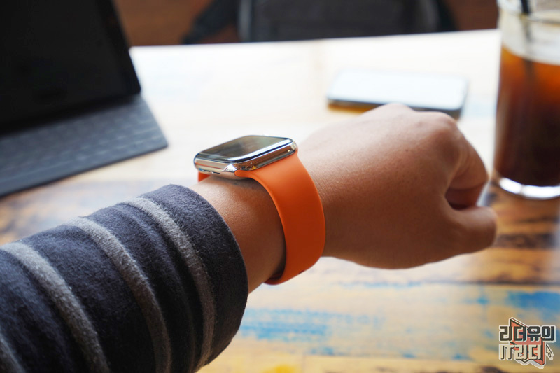 애플워치5 에르메스 에디션 오렌지 스포츠밴드를 착용한 모습입니다. 산뜻한 느낌 괜찮죠?