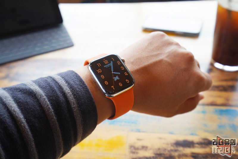 애플워치5 에르메스 에디션을 강조하는 오렌지색 워치페이스는 대기상태에서 워치페이스 형태가 변하지 않고 화면만 어두워집니다.