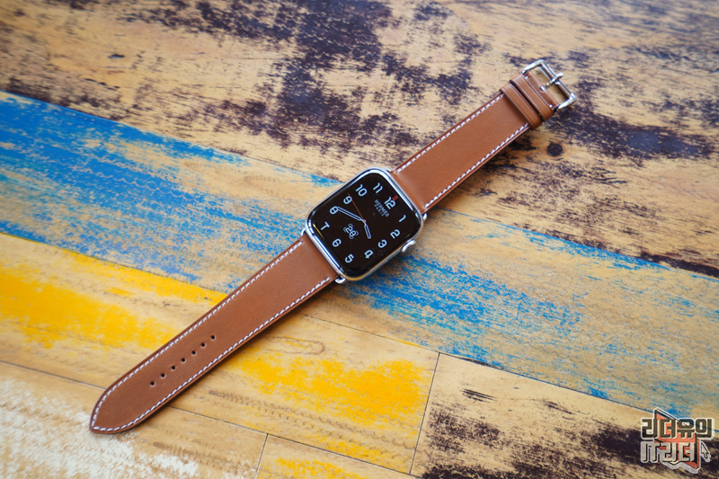 애플워치5 에르메스 에디션, 밴드까지 완벽 체결을 한 모습입니다. 애플워치5의 디지털 감성과 가죽밴드의 아날로그 감성 조합이 예쁘게 녹아 들어 있습니다.