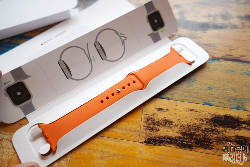 에르메스를 상징하는 오렌지색 스포츠 밴드가 추가 제공됩니다. 일반적인 애플워치5는 밴드 하나가 기본입니다. 이렇게 스포츠밴드가 제공되는 이유는 가죽밴드를 운동시에는 착용하지 못하기 때문에 배려한 것입니다. 오렌지색 밴드의 착용 모습도 아래에서 보여드리겠습니다.