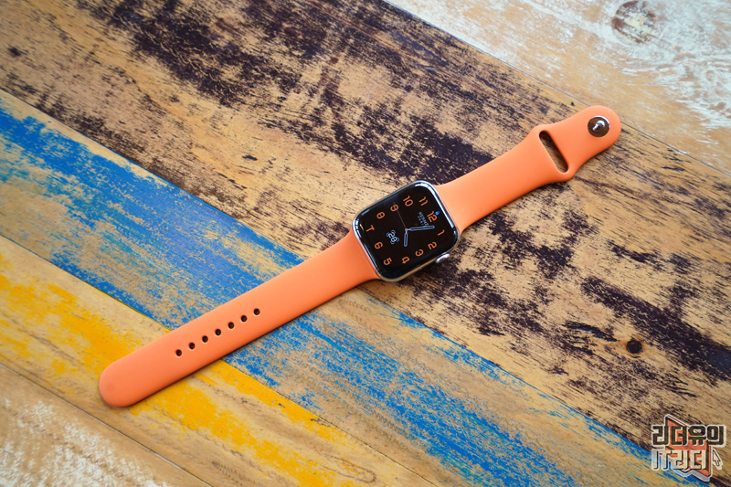 애플워치5 에르메스 에디션 오렌지 스포츠밴드를 착용한 모습입니다. 산뜻한 느낌 괜찮죠?