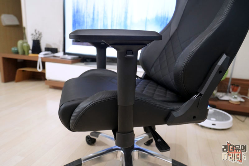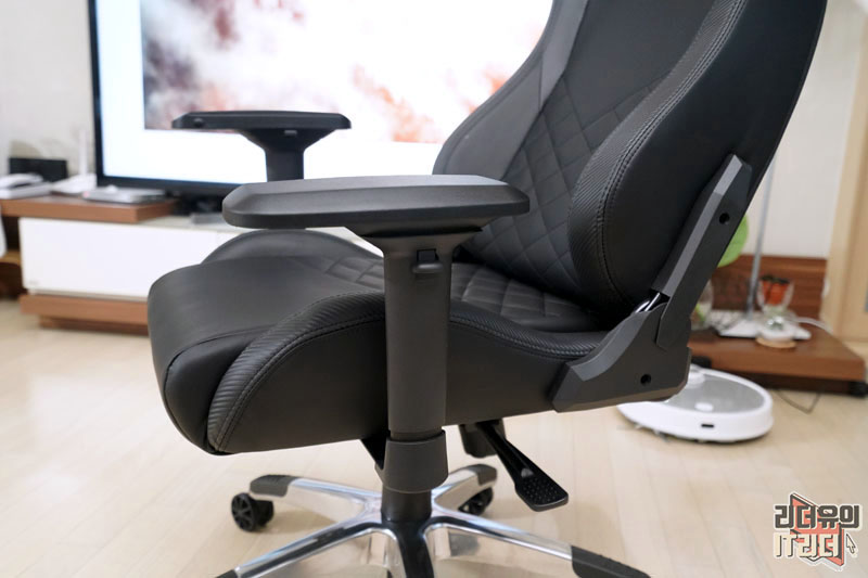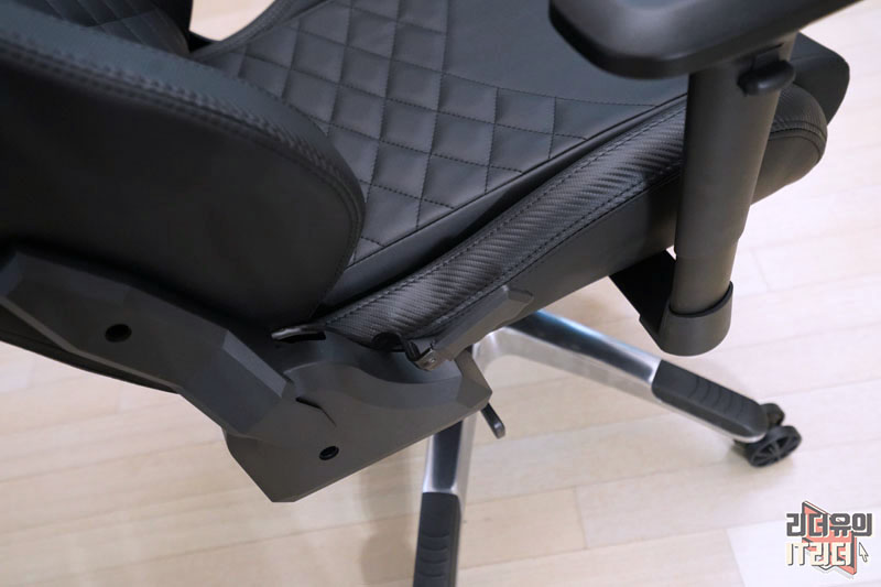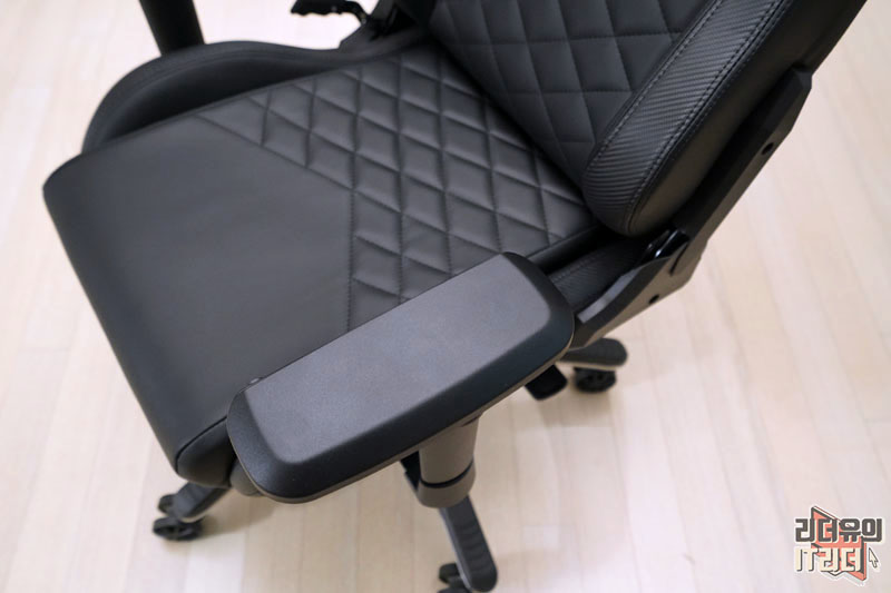 허리 받침대 부분과 시트 부분에는 다이아몬드 스티치가 들어가 우글거림 없이 잡아주는 역할을 하고 멋스러운 분위기를 느낄 수 있습니다. 그리고 시트 느낌은 물렁하지 않고 탄탄한 쿠션감을 가지고 있습니다. 저렴한 게이밍의자들은 물렁해서 허리가 틀어지기도 하는데 탄력있는 소재라 장시간 앉아 있기에도 좋습니다. 참고로 아레나 TYPE4는 최대 150kg의 무게를 지탱할 수 있는 튼튼한 내구성을 갖췄습니다.