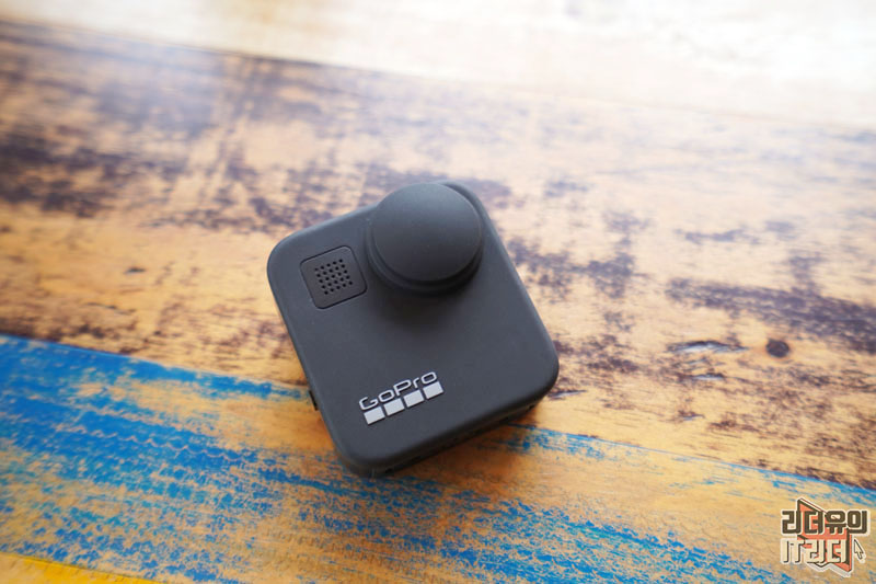 왼쪽에는 고프로 맥스를 상징하는 맥스 표시가 있고 스피커와 전원/모드 버튼이 있습니다.