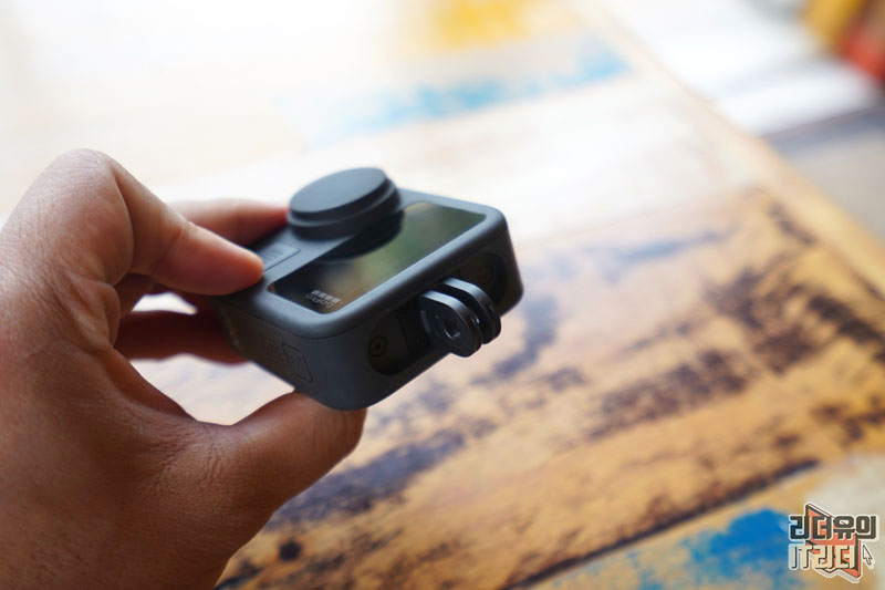 아래쪽에는 고프로 맥스의 또다른 변화 내장형 마운트가 있습니다. 기존 고프로 시리즈는 액세서리를 장착하기 위해 꼭 케이스를 씌워야 했는데요. 고프로 맥스에서는 그럴 필요가 없습니다.