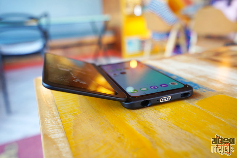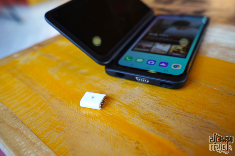 LG V50S ThinQ 듀얼스크린을 장착한 상태에서의 하단면의 모습입니다 USB-C 단자가 사라지고 포고핀 방식으로 충전단자가 있는걸 알 수 있습니다