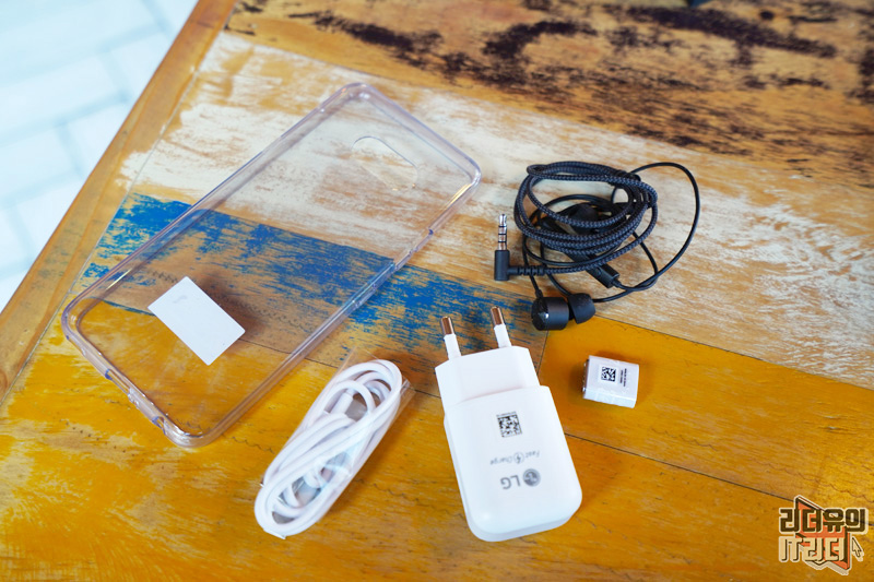 LG V50S ThinQ 구성품은 클리어 케이스, USB-C 케이블, 어댑터, 젠더, 이어폰으로 구성되어 있습니다.