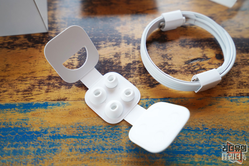 에어팟 프로 구성품으로 이어팁이 고급스럽게 들어 있고 USB-C to 라이트닝 케이블이 들어 있습니다. 이어팁의 경우 S, L 사이즈이고 기본 장착되어 있는 이어팁은 M 사이즈 입니다