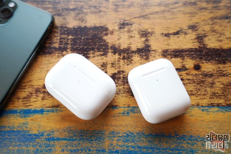 겹쳐본 느낌입니다. 에어팟 케이스의 가로 사이즈는 똑같고 세로로 좀 더 길게 에어팟 프로가 되어 있습니다.
