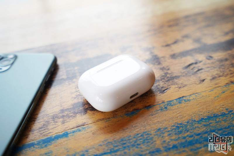 아래쪽에는 라이트닝 단자가 있습니다. 하지만 기본적으로 무선충전을 지원하기 때문에 무선충전 패드에 올려두면 더 편하게 충전하면서 사용할 수 있습니다. 참고로 에어팟 프로 사용 시간은 노이즈캔슬링 기능을 실행한 상태에서도 최대 4시간 30분이나 사용할 수 있습니다. 배터리 케이스와 함께 이용하기 때문에 24시간 이상 재생 할 수 있습니다.