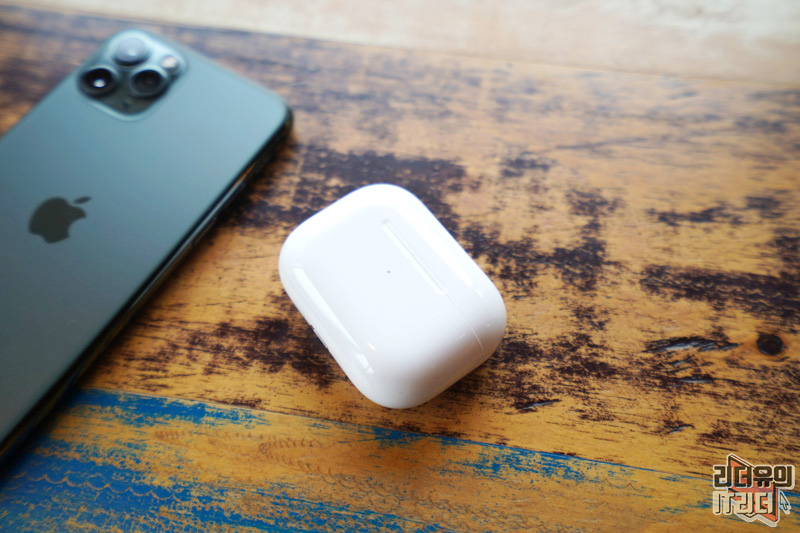아래쪽에는 라이트닝 단자가 있습니다. 하지만 기본적으로 무선충전을 지원하기 때문에 무선충전 패드에 올려두면 더 편하게 충전하면서 사용할 수 있습니다. 참고로 에어팟 프로 사용 시간은 노이즈캔슬링 기능을 실행한 상태에서도 최대 4시간 30분이나 사용할 수 있습니다. 배터리 케이스와 함께 이용하기 때문에 24시간 이상 재생 할 수 있습니다.