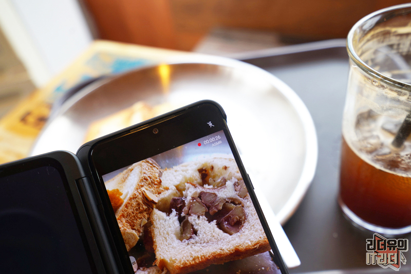 화면이 두개이기 때문에 이렇게 접어서 찍으면 바닥을 찍기에 좋습니다. 보통 하나의 화면이면 카메라를 바닥으로 두면 어떻게 찍히는지 안 보이지만 LG V50S ThinQ는 미러링 화면으로 어떻게 사진과 영상을 찍는지 쉽게 볼 수 있습니다.