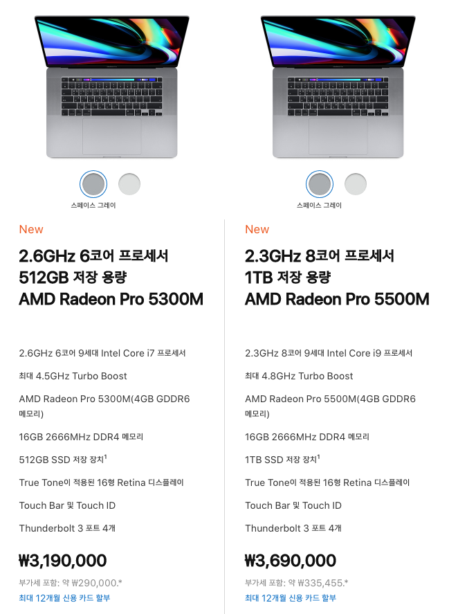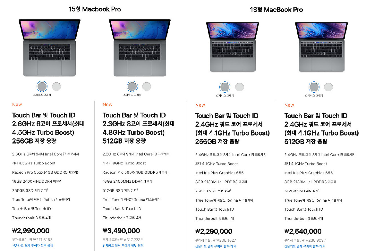 참고로 기존 2019 맥북프로 15 가격입니다. 저장공간, 하드웨어의 변화를 생각하면 가격 상승폭이 거의 없다고 봐도 될 것 같습니다.