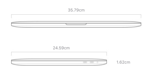 맥북프로 16 가로 길이는 35.79cm로 맥북프로 15 34.93cm에 비해 0.86cm 커졌습니다. 세로는 24.59cm로 맥북프로 15 24.07cm에 비해 0.52cm 커졌습니다. 두께도 늘어났는데요. 맥북프로 16은 1.62cm이고 맥북프로 15는 1.55cm 입니다. 무게 차이도 맥북프로 16 무게는 2kg, 맥북프로 15는 1.83kg 입니다.