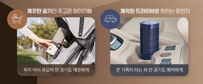 물론 자동차에 고정으로 두고 사용하는 공기청정기도 있지만 자동차를 매일, 그리고 자주 이용하는 사람이 아니라면 그렇게 방치되는 공기청정기 보다는 휴대용 공기청정기로 그때그때 사용하는게 더 좋을 수 있습니다.