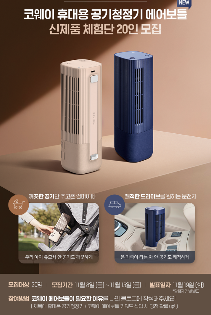 코웨이 에어보틀을 먼저 만나볼 체험단을 11월 15일까지 받고 있습니다. 앞으로 대세가 될 휴대용 공기청정기이니 주목해 보시면 좋을 것 같습니다.