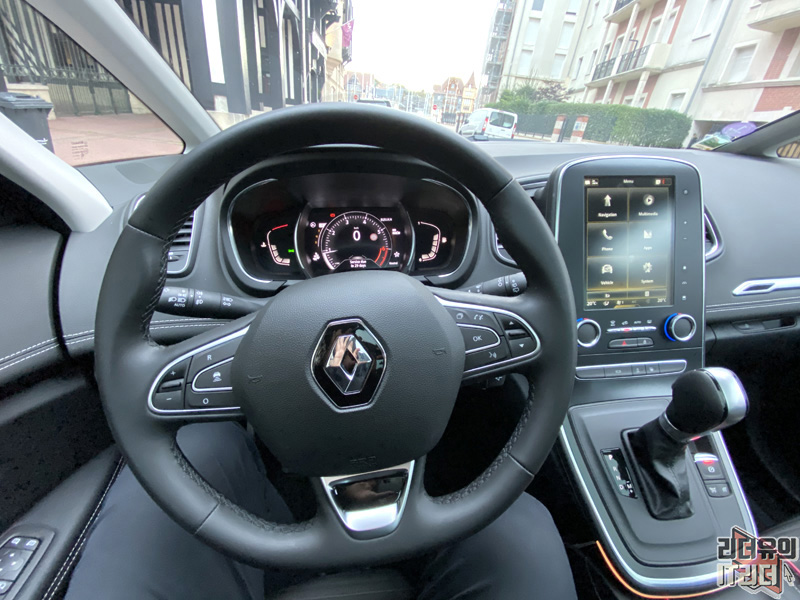 르노 그랜드 세닉 핸들입니다. 핸들 디자인이나 그립감도 다른 르노 차와 똑같게 되어 있습니다. 핸들링 좋고 1300cc 이지만 고속주행에도 흔들림 없는 핸들링이 매력적이었습니다.