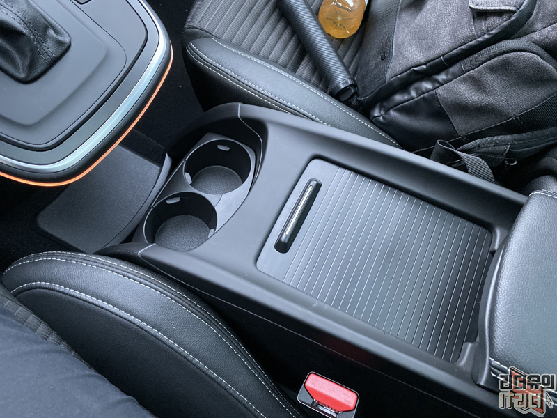가운데 팔걸이 부분을 뒤로 밀면 안쪽에 숨겨진 컵홀더가 나옵니다. 컵홀더가 필요 없을때는 밀어 넣어 깔끔한 실내 공간을 유지할 수 있게 했습니다.