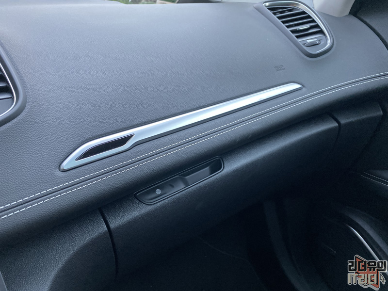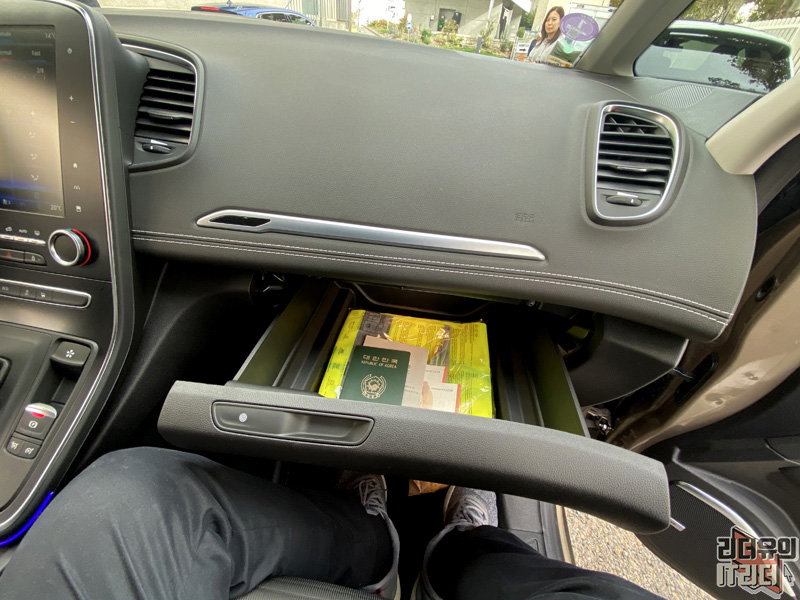 그리고 조수석에도 여유로운 수납공간이 있습니다. 보통 이 공간은 비스듬하게 열려서 수납공간이 넉넉하지 않은데 르노 그랜드세닉은 이곳이 서랍 형태로 되어 있습니다. 그래서 작은 가방을 넣어놔도 될 정도로 여유롭습니다. 열리는 방식도 터치 버튼으로 열 수 있게 해 감각적인 사용이 가능합니다. 참고로 닫을때는 수동입니다.