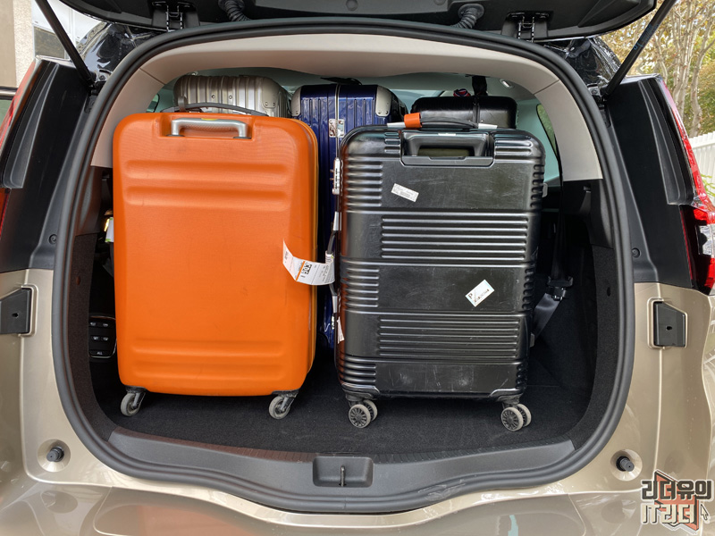 3열을 접으면 공간이 평평해져 여유롭게 짐을 넣을 수 있습니다. 대형 캐리어 5개를 뒤에 실은 모습입니다. 캠핑, 패밀리카로 충분한 매력을 가지고 있습니다.