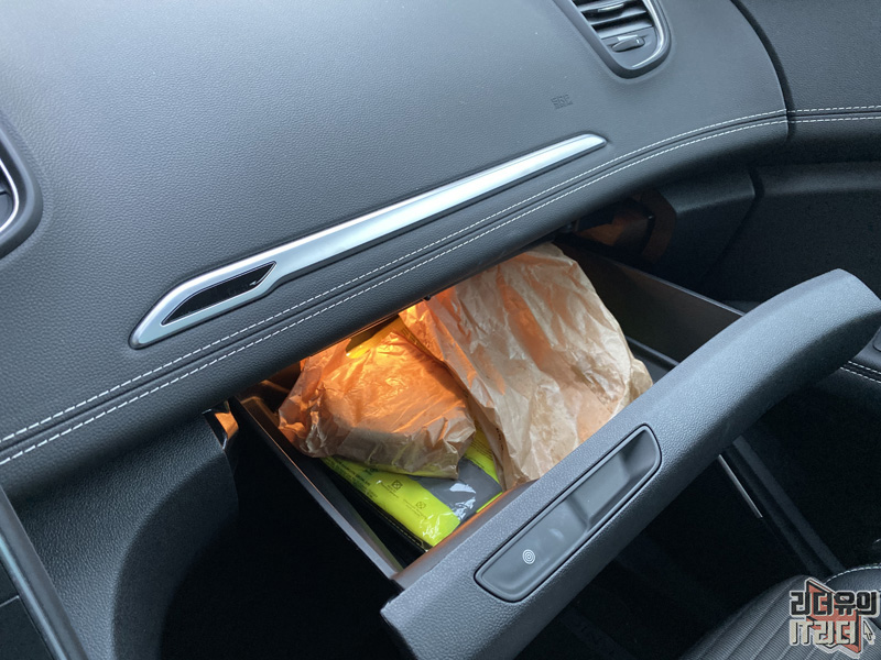 그리고 조수석에도 여유로운 수납공간이 있습니다. 보통 이 공간은 비스듬하게 열려서 수납공간이 넉넉하지 않은데 르노 그랜드세닉은 이곳이 서랍 형태로 되어 있습니다. 그래서 작은 가방을 넣어놔도 될 정도로 여유롭습니다. 열리는 방식도 터치 버튼으로 열 수 있게 해 감각적인 사용이 가능합니다. 참고로 닫을때는 수동입니다.