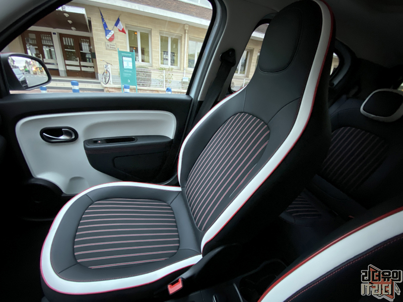 르노 트윙고 르꼬끄 에디션의 운전석과 조수석의 모습입니다. 시트에는 스트라이프를 감각적으로 적용해 화려한 매력을 느낄 수 있고 레드 포인트로 평범한 차가 아님을 알 수 있습니다.