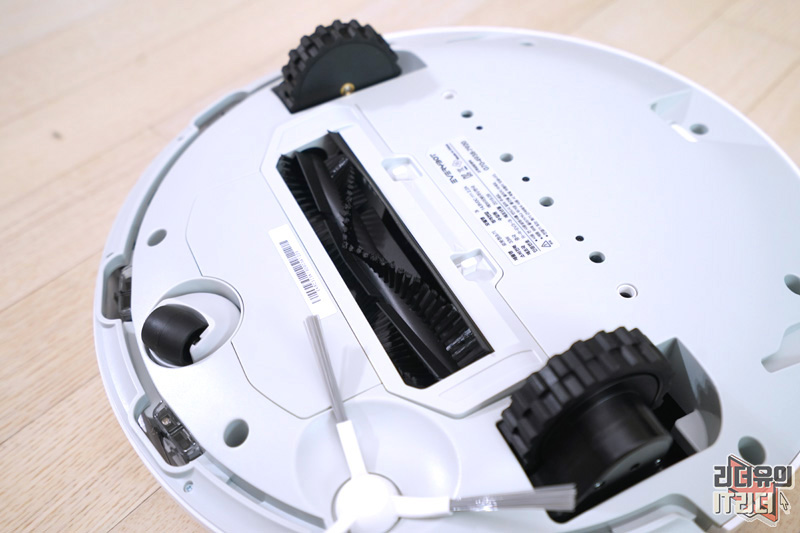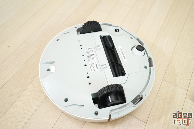 에브리봇 3i 바닥면 모습입니다. 보통의 로봇청소기 디자인과 다르지 않습니다. 턱을 넘나드는 대형 바퀴가 있고 가운데 흡입구에는 회전 솔이 있습니다.
