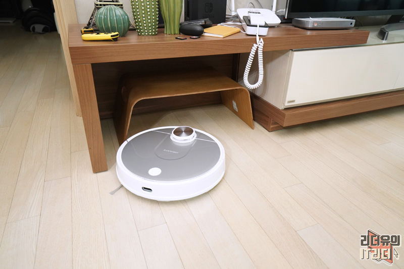 에브리봇 3i가 좋은점은 사물을 세게 밀지 않는다는 것입니다. 이렇게 가벼운 탁자의 경우도 사물을 잘 파악해서 딱 필요한 영역만 청소를 하고 빠집니다