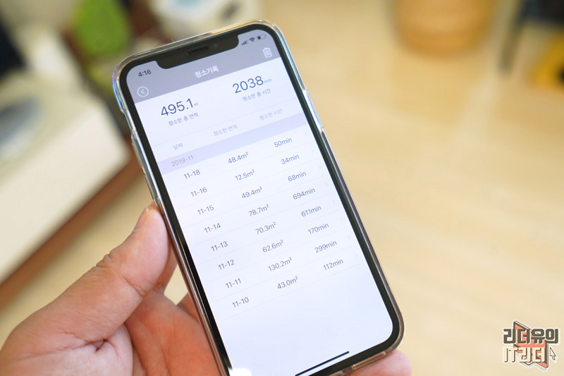 청소기록을 보면 날짜, 청소한 면적, 청소한 시간을 리스트로 볼 수 있습니다. 로봇청소기를 사용하면 좋은점은 사람이 직접 청소를 안하니 수시로 할 수 있다는게 장점입니다. 어떤날은 694분까지도 청소를 시켰습니다