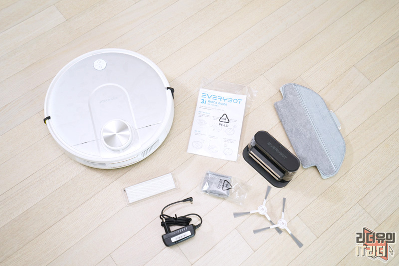 에브리봇 3i 구성품은 본체, 걸레 키트, 극세사 걸레 2장, 충전기, HEPA 필터 2개(하나는 먼지통에 부착되어 있음), 전원 어댑터, 청소용 브러시, 사이드 브러시 2개가 제공됩니다.