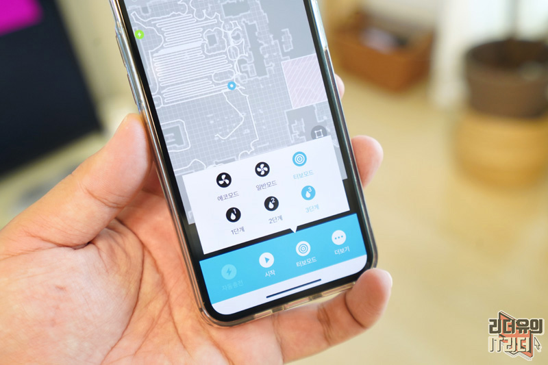 그리고 앱으로 다양한 컨트롤을 할 수 있습니다. 청소 세기를 에코모드, 일반모드, 터보모드로 할 수 있고 물걸레 청소시에는 물분사량을 1단계, 2단계, 3단계 조절 할 수 있습니다