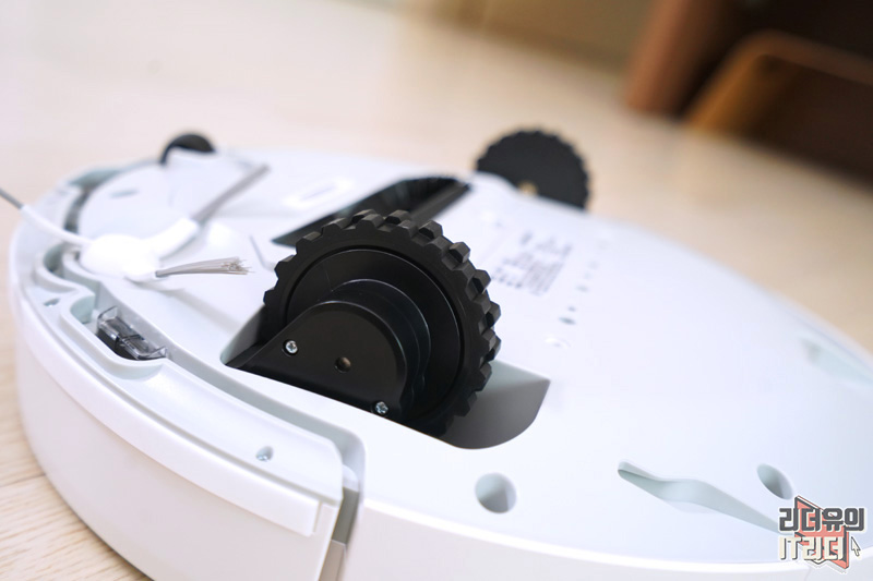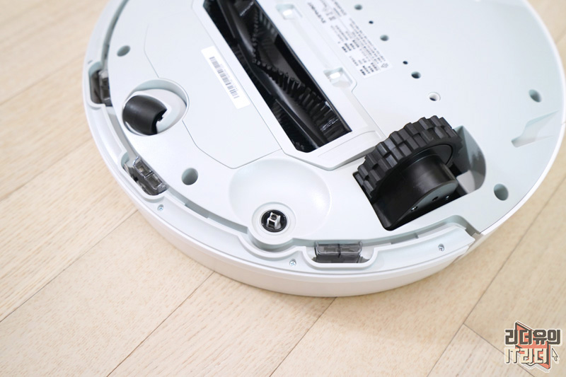 에브리봇 3i 바닥면 모습입니다. 보통의 로봇청소기 디자인과 다르지 않습니다. 턱을 넘나드는 대형 바퀴가 있고 가운데 흡입구에는 회전 솔이 있습니다.