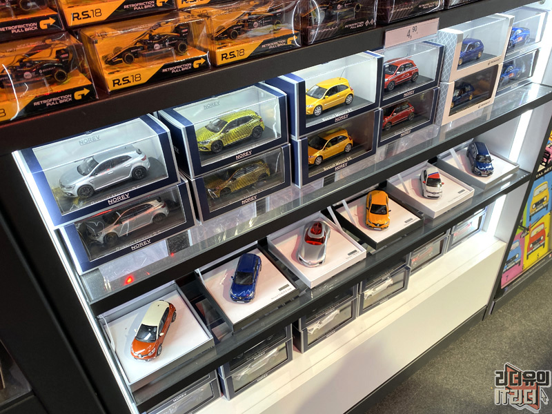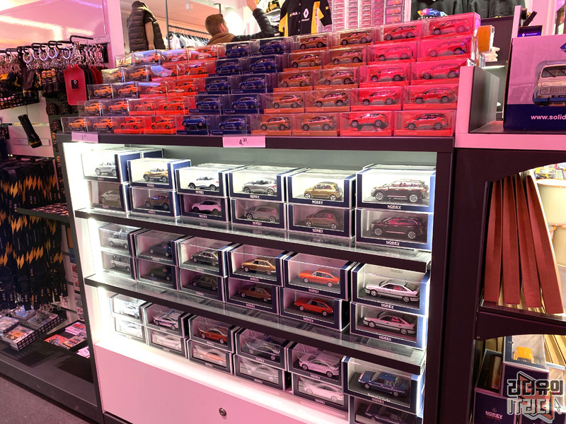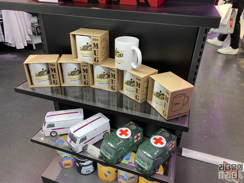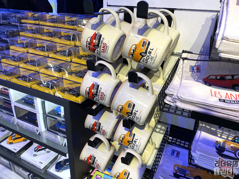 르노 굿즈니까 자동차 피규어들이 가득 준비되어 있고 머그컵, 열쇠고리, 옷 등 종류가 다양합니다.