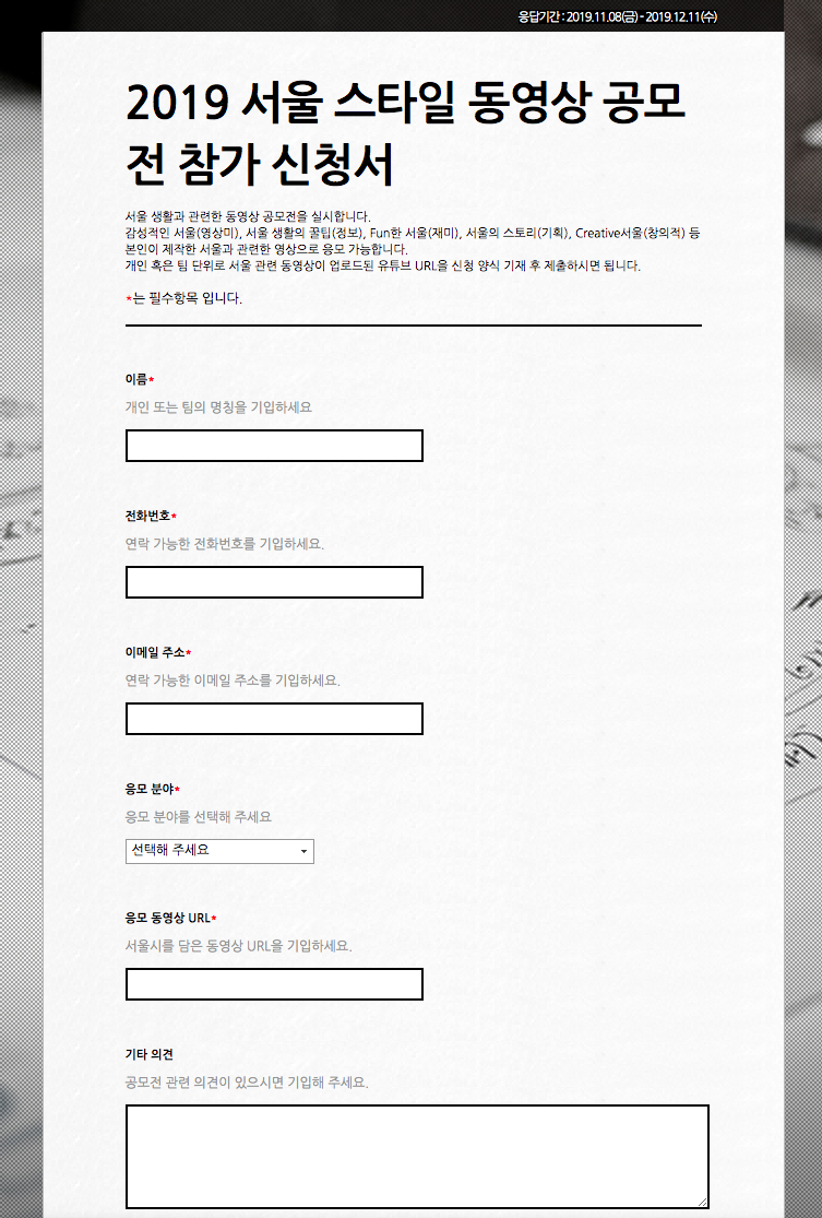 여러분은 어떤 아이디어로 서울을 바라 볼 것인가요? 어떤 영상을 담으면 사람들이 좋아할까 잘 고민해 보시고 도전해 보시기 바랍니다. 기간은 12월 8일까지 입니다.