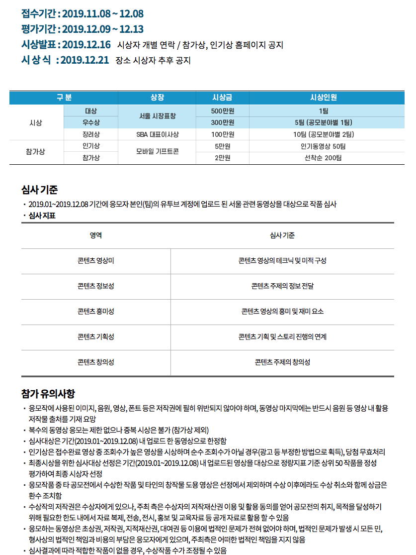 시상 내용이 가장 관심이 갈텐데요. 대상은 서울 시장 표창으로 500만원의 상금을 받을 수 있고 우수상은 300만원 2팀, 장려상은 100만원씩 10팀 입니다. 인기상은 5만원, 참가상은 2만원 기프트콘이 주어집니다. 도전해 볼만 하겠죠. 이건 무조건 하셔야 합니다.