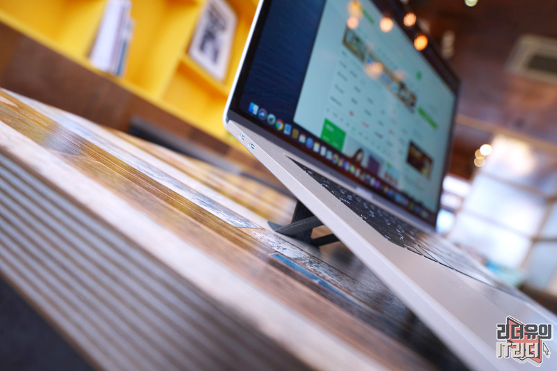 맥북프로를 펼치면 이런 느낌으로 사용하게 됩니다. 괜찮죠~ 어디서나 입력이 편한 각도를 만들 수 있기 때문에 사용하기 좋습니다.