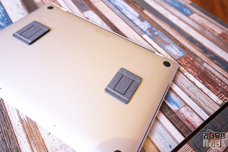실제로 저는 부착한 상태에서 가방에 휴대하고 다닙니다. 그리고 접착력이 약해서 떨어지지 않을까 걱정하실 수 있는데 그 부분도 걱정하지 않으셔도 됩니다. 부착된 상태에서 들어도 쉽게 떨어지지 않을 정도로 강한 부착력을 가지고 있습니다. 맥북프로 15 무게가 약 2kg이기 때문에 당연히 한손으로 들면 떨어지지만 쉽게 떨어지지 않는다는 것이 포인트 입니다.
