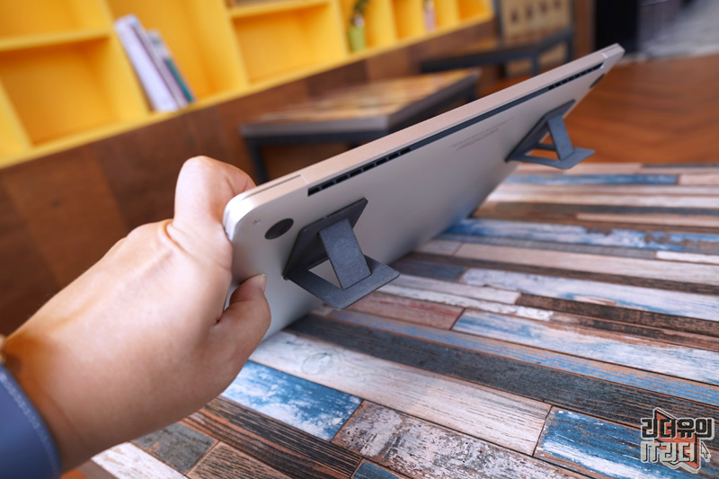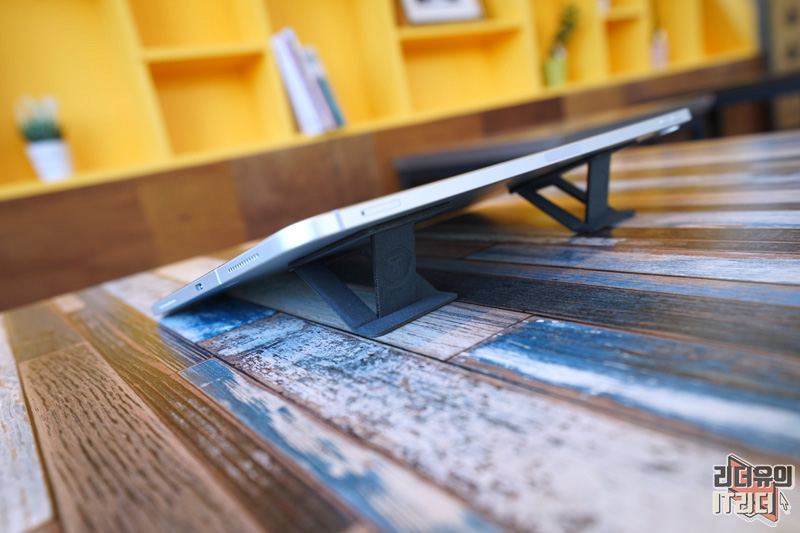 일반적인 노트북 스탠드는 멋스러운 매력과 각도가 더 높게 된다는 장점이 있습니다. 그래서 집이나 회사에서는 이렇게 사용하는 것도 매력적입니다. 그런데 휴대하면서도 사용하실 분들은 테스모 킥스탠드를 주목해 볼 필요가 있습니다. 물론 집이나 회사에서도 사용 가능합니다. 너무나 간단하기 때문에 어디서나 노트북 스탠드로 사용할 수 있다는 강점이 있습니다. 그리고 테스모 킥스탠드를 붙인 상태에서는 일반적인 노트북 스탠드에 그냥 올려서 사용도 가능하기 때문에 어느 하나를 포기하지 않아도 된다는 점이 좋습니다.
