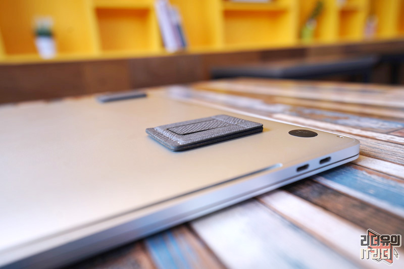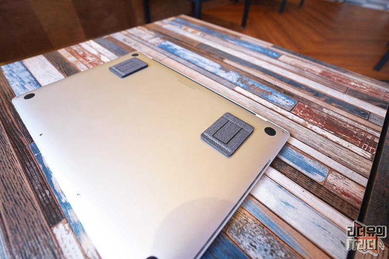 테스모 킥스탠드를 맥북프로에 부착한 모습입니다. 부착시 위아래 방향만 잘 맞춰서 하면 되기 때문에 부착이 어렵지 않습니다. 그리고 잘못 부착 했더라도 다시 떼서 부착하면 되기 때문에 실패에 대한 부담도 없습니다.