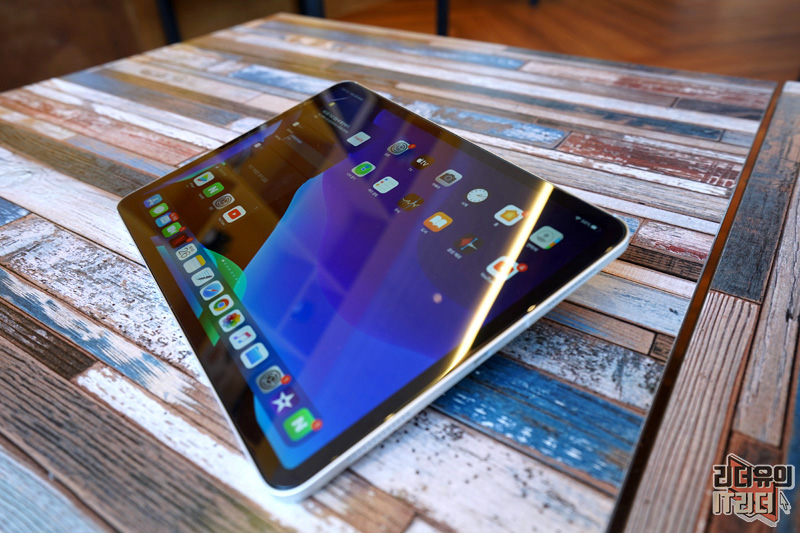 아이패드 프로 3세대에 테스모 킥스탠드를 부착한 모습입니다. 별도의 케이스나 거치대를 사용하지 않는 분이라면 이렇게 거치해서 그림이나 간단한 입력을 할 수 있습니다.