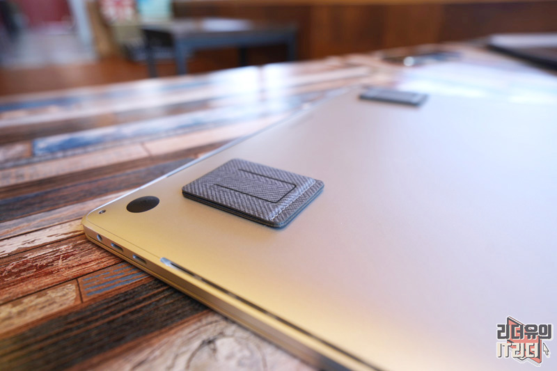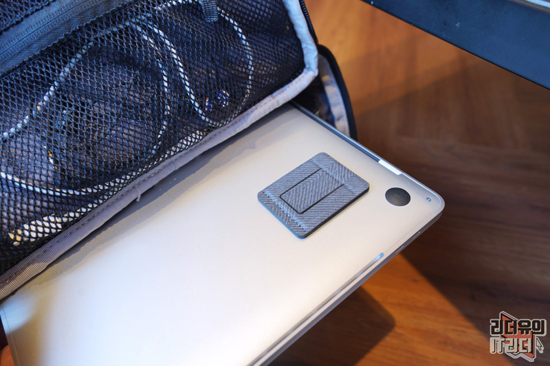 실제로 저는 부착한 상태에서 가방에 휴대하고 다닙니다. 그리고 접착력이 약해서 떨어지지 않을까 걱정하실 수 있는데 그 부분도 걱정하지 않으셔도 됩니다. 부착된 상태에서 들어도 쉽게 떨어지지 않을 정도로 강한 부착력을 가지고 있습니다. 맥북프로 15 무게가 약 2kg이기 때문에 당연히 한손으로 들면 떨어지지만 쉽게 떨어지지 않는다는 것이 포인트 입니다.