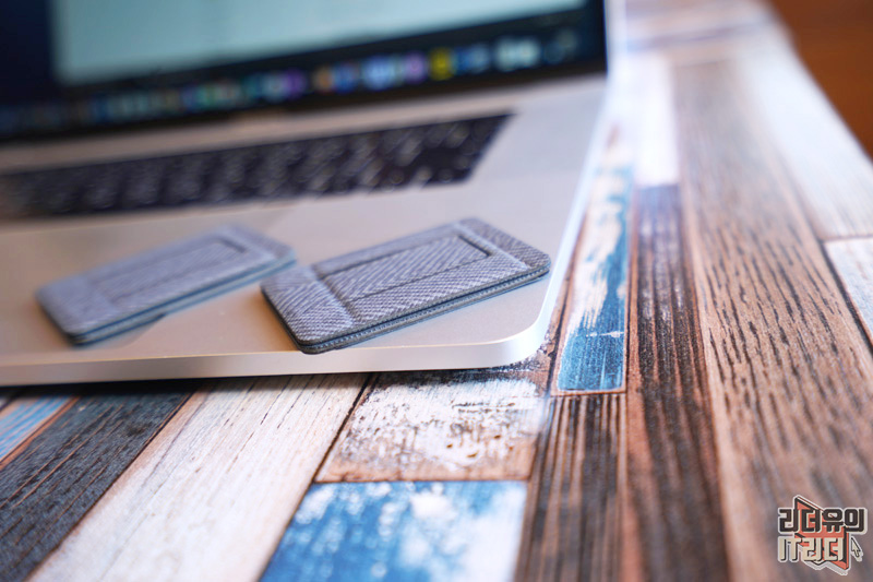 테스모 킥스탠드를 맥북프로에 부착한 모습입니다. 부착시 위아래 방향만 잘 맞춰서 하면 되기 때문에 부착이 어렵지 않습니다. 그리고 잘못 부착 했더라도 다시 떼서 부착하면 되기 때문에 실패에 대한 부담도 없습니다.